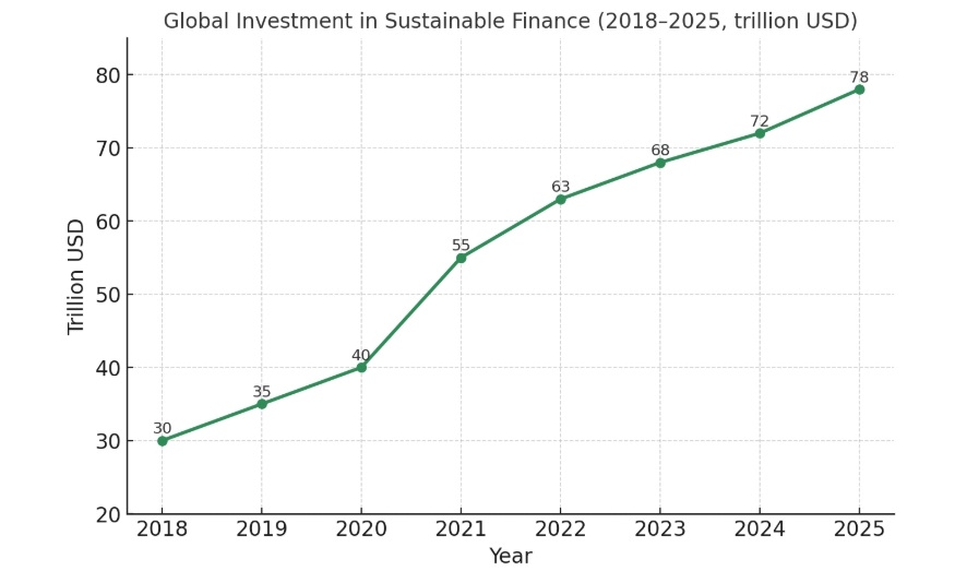 Figure 1 — Global Investment in Sustainable Finance (trillion USD, 2018–2025)
