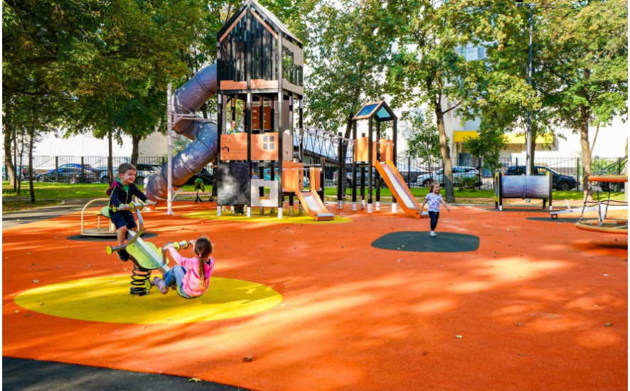 Для детей создали огромную игровую площадку с учётом всех возрастов. На мягком безопасном покрытии установили карусель, качели всех видов и балансиры. Построили игровые городки с горками и лазалками. А ещё сделали огромную песочницу с навесами и интересными развивающими механизмами.