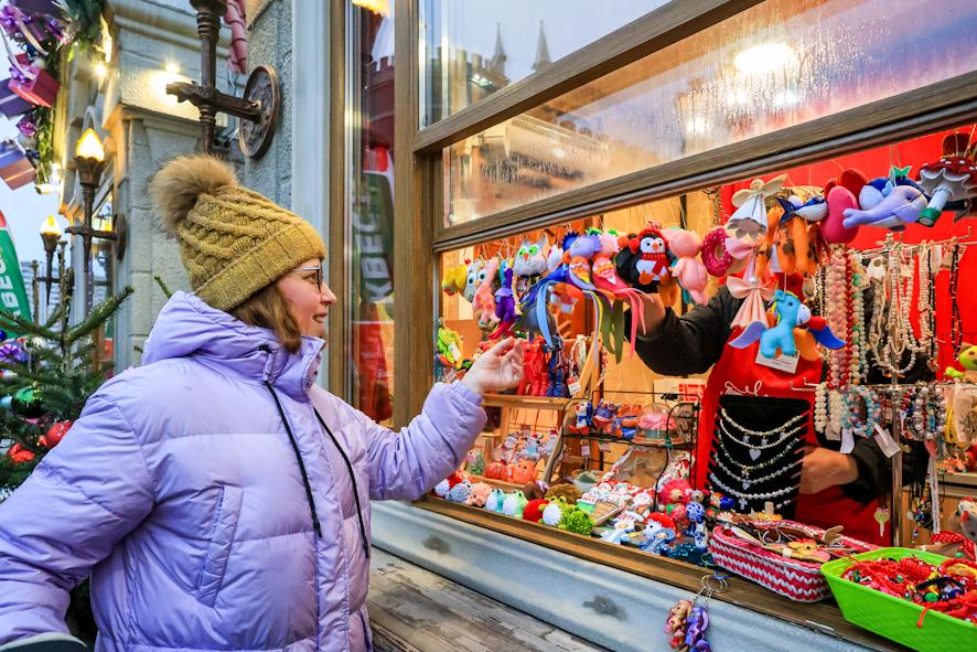 В торговых рядах можно приобрести картины и вручную расписанные сувениры у художников. К покупке подарков располагает изобилие елочных игрушек, ватных фигурок, кукол на прилавках, для украшения дома предложат изделия из эпоксидной смолы, деревянные миниатюры, глиняные и фарфоровые изделия и моссариумы.