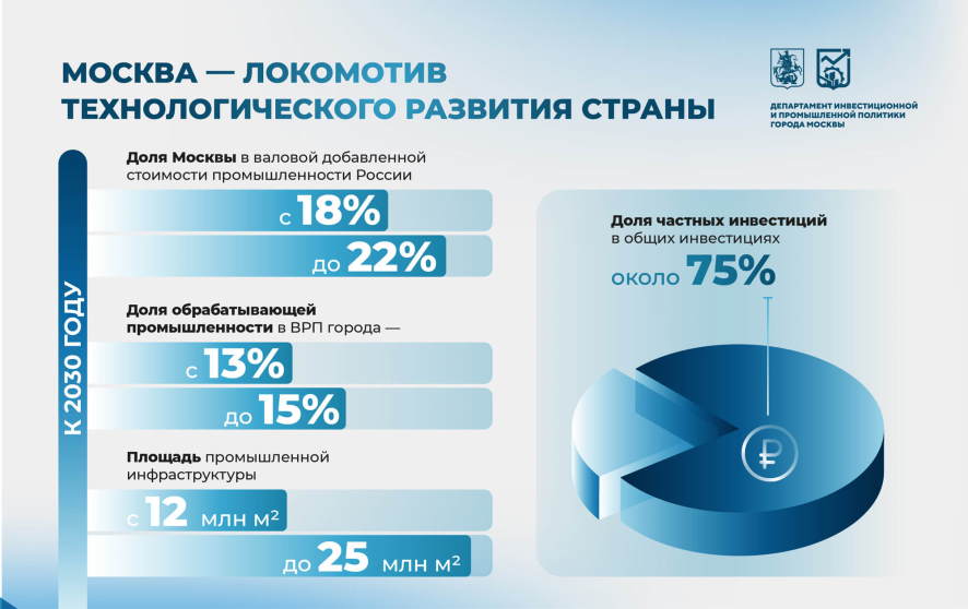 Сегодня Правительство Москвы сосредоточено на поддержке приоритетных высокотехнологичных производств, а также повышении доступности и качества промышленной инфраструктуры – к 2030 г. она должна достигнуть 25 млн кв. м. При этом доля частных инвестиций в развитие производств составит около 75%.