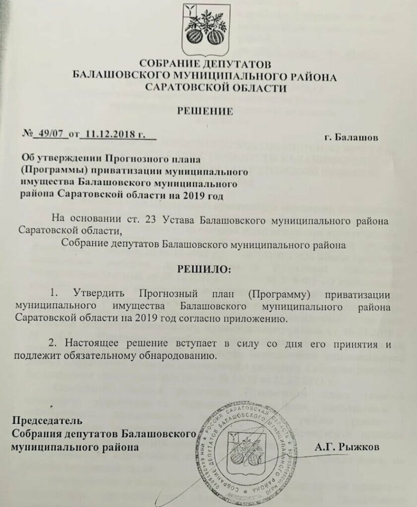 Депутаты Сергей Гладков, Алексей Кольцов, Василий Кравцов, Мария Усова и Дмитрий Лыгин проанализировали вопросы отчуждения имущества в Балашовском районе. В частности, речь идет о решении от 11 декабря 2018 года, подписанном действовавшим на тот момент председателем Собрания депутатов Балашовского муниципального района Андреем Рыжковым. Этим решением в общей массе предлагалось отдать на продажу сразу 13 объектов, в которых ранее размещались учебные заведения или учреждения культуры как в селах, так и в районном центре. Например, здания школы в с. Рассказань, детского сада «Солнышко» в п. Октябрьский, школы в с. Львовка, детсада «Ежик» в с. Хоперское, школы № 4 в Балашове и даже автобус для перевозки детей. Кроме этого, в списках был и ранее переданный муниципалитету комплекс зданий военной части: казармы, кухня-столовая, банно-прачечный комплекс, учебные мастерские, учебный корпус с классами на 300 мест.