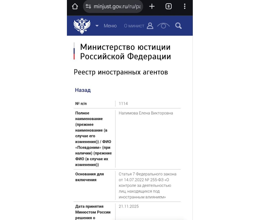 Налимова распространяла недостоверную информацию о принимаемых органами публичной власти Российской Федерации решениях и проводимой ими политике. Принимала участие в распространении для неограниченного круга лиц сообщений и материалов иностранных агентов, а также участвовала в распространении сообщений и материалов организаций, включенных в перечень иностранных и международных организаций, деятельность которых признана нежелательной на территории Российской Федерации, — указано в распоряжении Минюста.