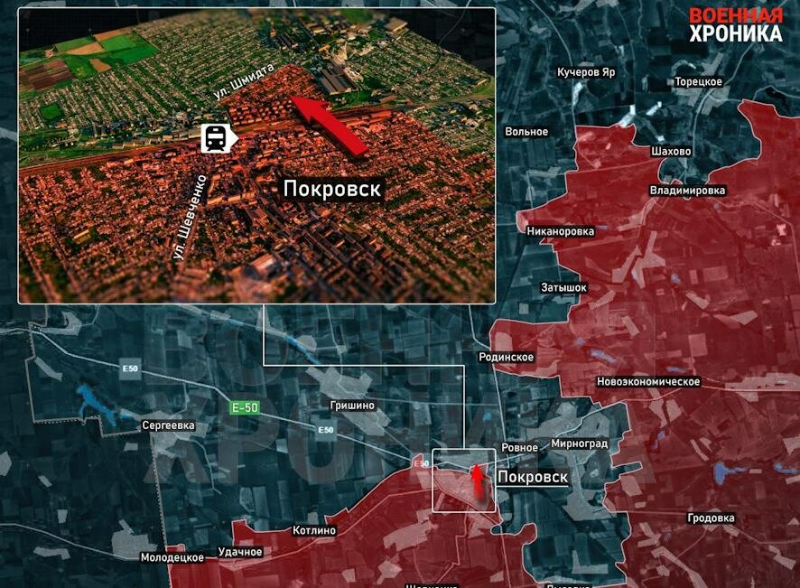Ситуация в Покровске близка к кульминации. Под контролем РФ примерно 75–80 процентов городской застройки с юга и часть железной дороги, разделявшей город. Остатки обороны сосредоточены на северных окраинах за железной дорогой, которую российские штурмовые подразделения уже пересекли, что резко осложняет снабжение и маневрирование ВСУ.
