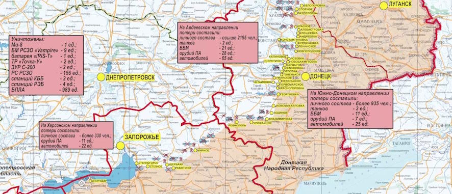 Нанесено поражение формированиям десантно-штурмовой, танковой, двух аэромобильных, четырех механизированных и двух штурмовых бригад ВСУ, а также трех бригад теробороны в районах населенных пунктов Раздоловка, Красное, Андреевка, Клещеевка, Курдюмовка, Константиновка и Георгиевка Донецкой Народной Республики.