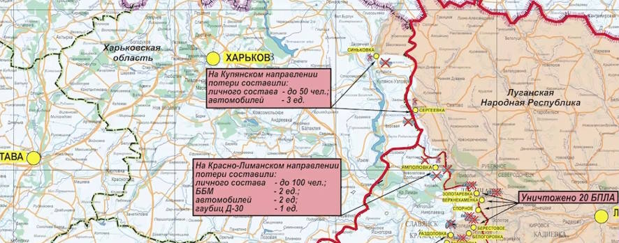 В районах н.п. Синьковка (Харьковская область) и Сергеевка (ЛНР) подразделениями «Западной» группировки войск отражены 5 атак 43-й, 115-й механизированных, а также 68-й егерской бригад ВСУ .