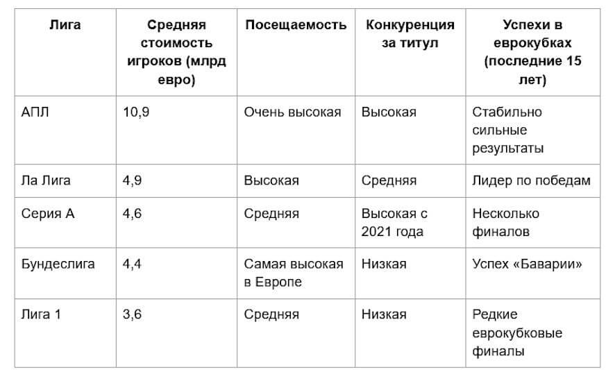 Конечно, таблица не передает всех оттенков: где-то важнее методы работы с молодежью, где-то атмосфера на трибунах, а где-то уровень тренерской школы. Но она сразу дает понимание — почему именно эти пять чемпионатов десятилетиями держатся на вершине футбольной пирамиды.